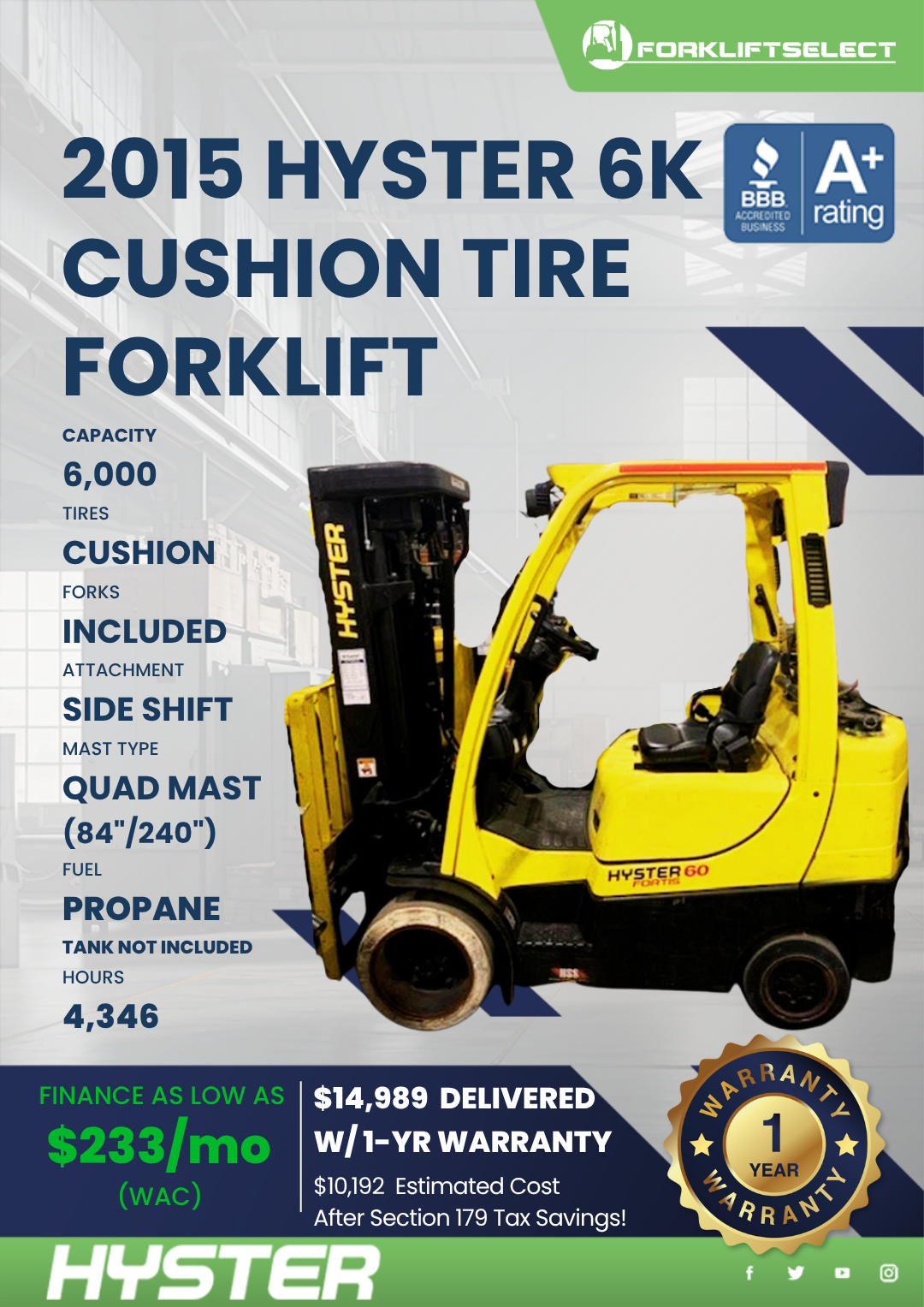 2015 HYSTER 6K CUSHION TIRE FORKLIFT