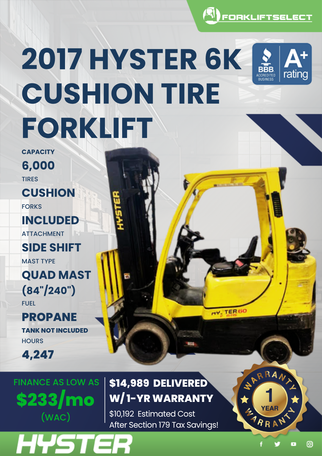 2017 HYSTER 6K CUSHION TIRE FORKLIFT