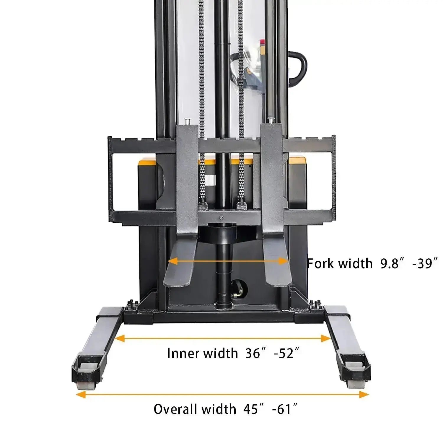 This electric stacker boasts a lifting height of 98 inches, making it perfect for reaching high shelves or stacking items in tight spaces. However, its versatility doesn’t stop there; it also features smooth operation and precise control, so users can easily maneuver it even in crowded environments. Additionally, the ergonomic design ensures that operators remain comfortable during long shifts.